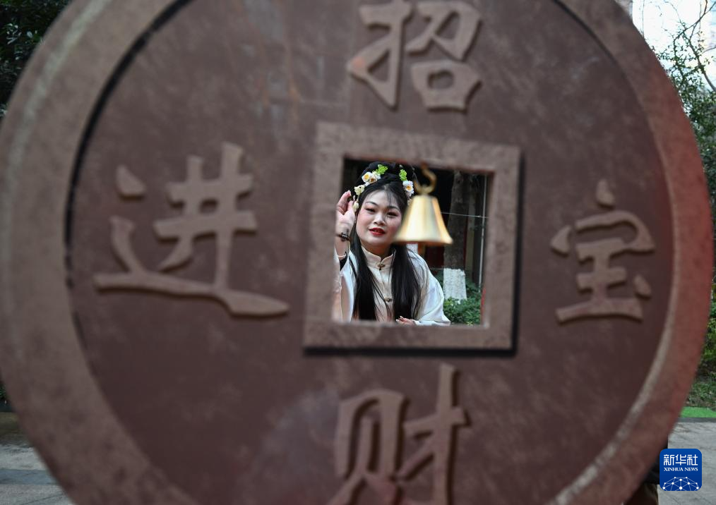 1月19日,身着汉服的居民在社区庙会上猜灯谜。
