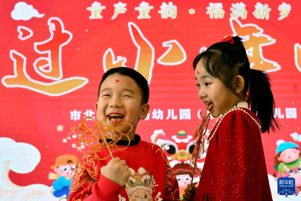 1月22日,孩子们在浙江省湖州市德清县乾元镇直街社区新时代文明实践点表演戏曲。