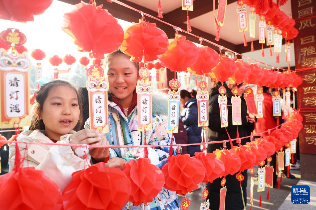 2月11日,在浙江杭州市西湖区北山街道元宵文化庙会活动中,社区居民在猜灯谜。