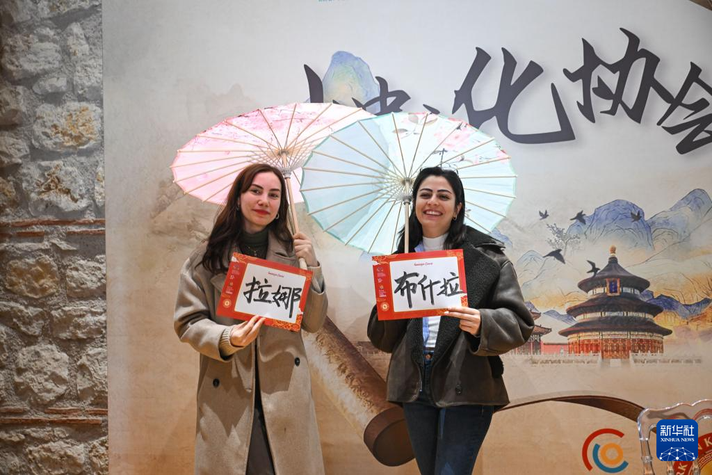 2月25日,两名土耳其观众在第十届伊斯坦布尔出版联谊会中国文化展区拍照留影。