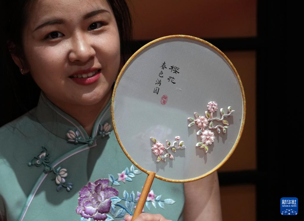 3月16日,在静安首发品牌馆,龙凤旗袍非遗传承人吴玉婷在展示手工盘扣樱花季系列新品。