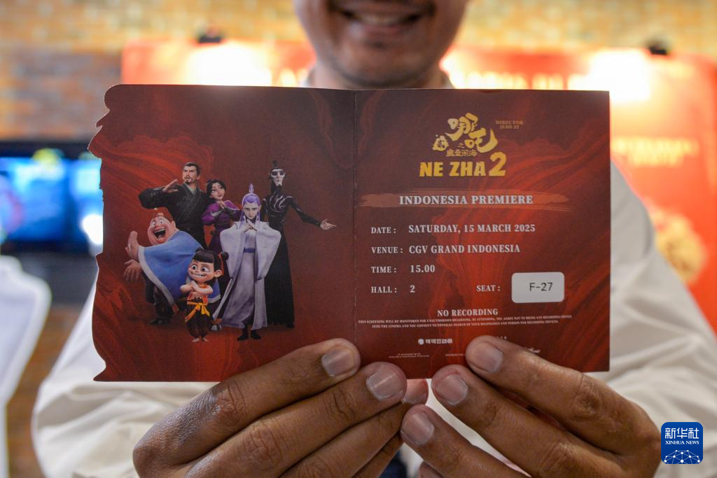 3月15日,在印度尼西亚雅加达,一名参加《哪吒之魔童闹海》首映礼的观众展示电影票。