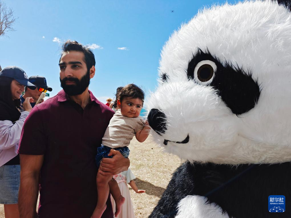 3月16日,一名儿童在新西兰奥克兰举行的新西兰中国儿童文化日活动上与大熊猫人偶互动。