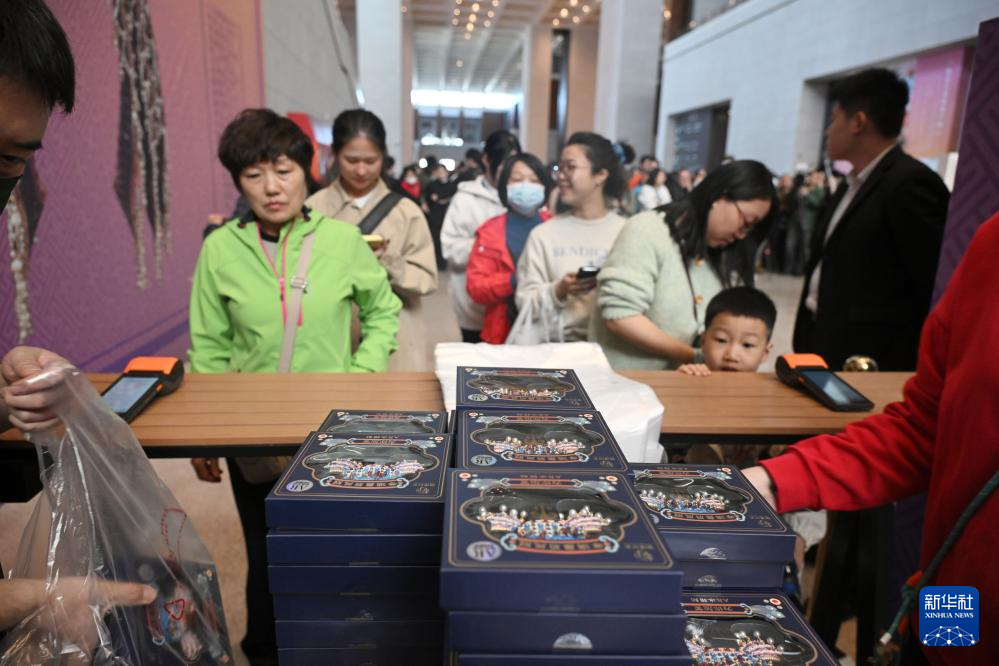3月25日,观众在北京中国国家博物馆排队购买凤冠冰箱贴。