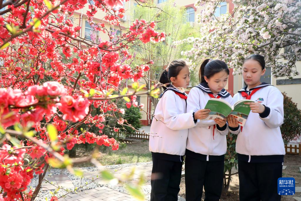 4月1日,山东省滨州市博兴县第一小学学生在校园里读书。