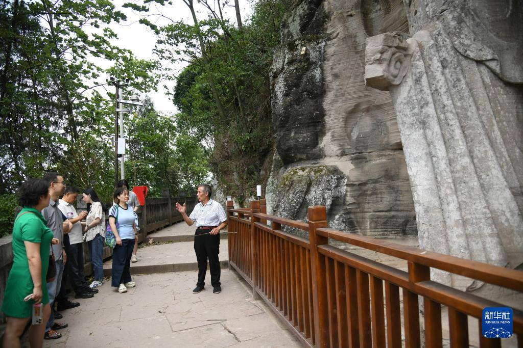 曾祥余(右一)为游客讲解石窟内容(6月14日摄)。