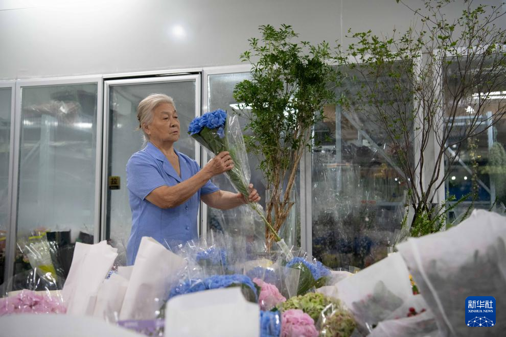 10月10日,在位于安徽合肥的一家花店,付玉兰挑选用于插花创作的花材。