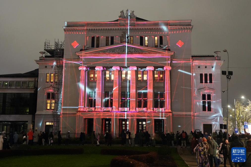 11月17日,民众在拉脱维亚首都里加举行的灯光节上欣赏被照亮的国家歌剧舞剧院。