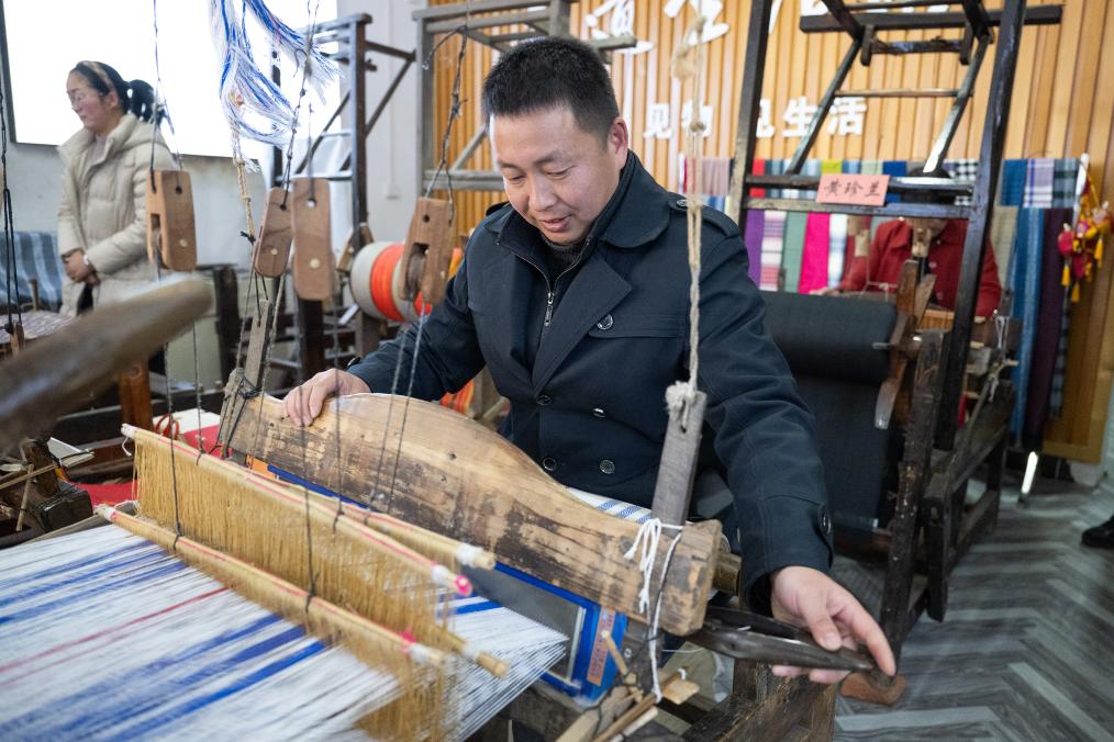陶文成现场展示大布织造工艺。新华社记者肖艺九 摄