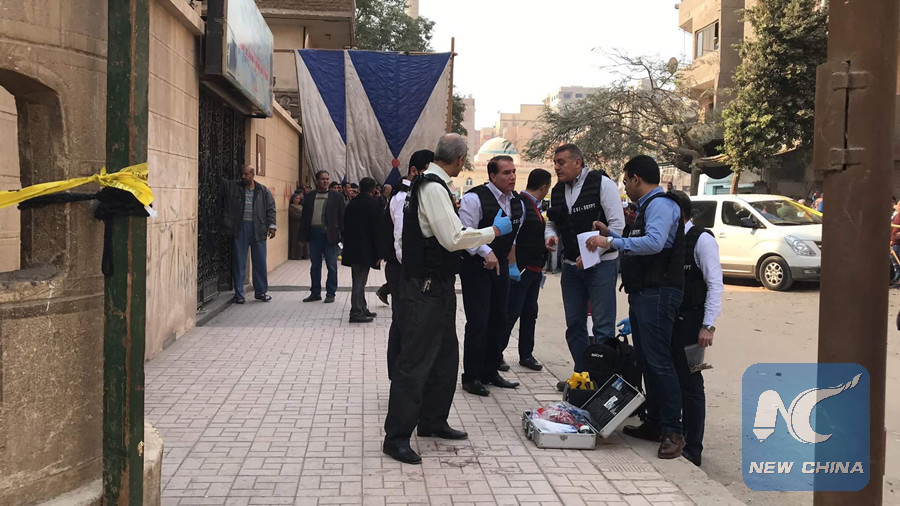 Egyptian policemen inspect the church attack site in Cairo, Egypt on Dec. 29, 2017. (Xinhua/Ahmed Gomaa)