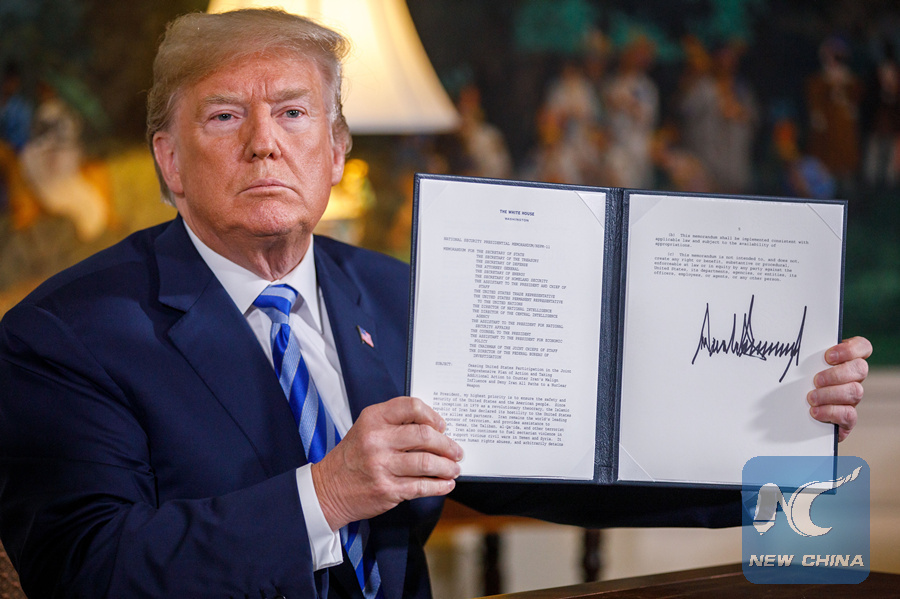 U.S. President Donald Trump displays a signed presidential memorandum at the White House in Washington D.C., the United States, on May 8, 2018. (Xinhua/Ting Shen)