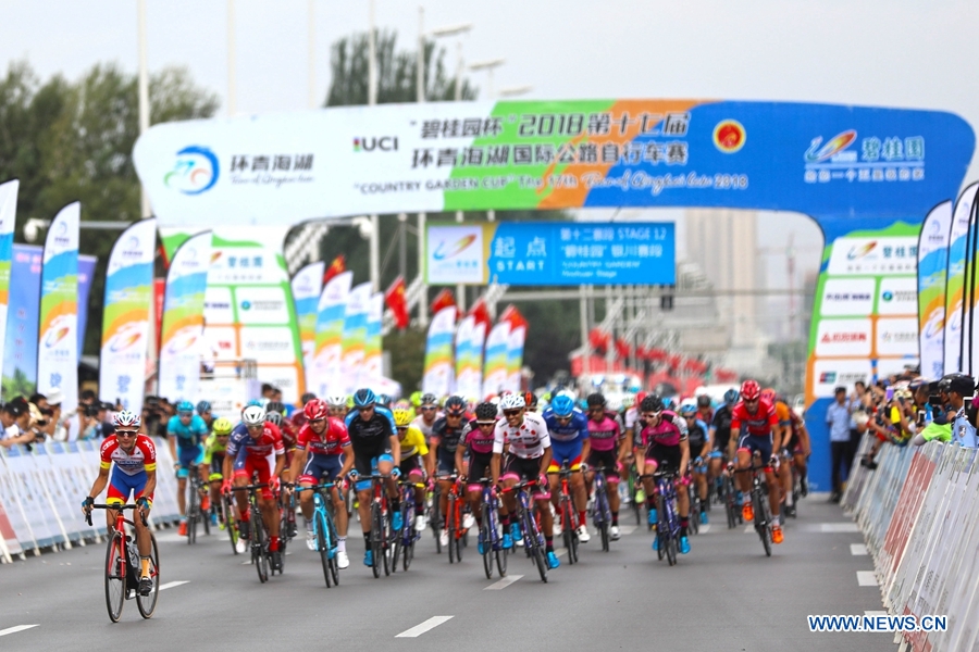Cyclists start to compete in the twelfth stage of the Tour of Qinghai Lake in Yinchuan, northwest China's Ningxia Hui Autonomous Region, on August 3, 2018. (Xinhuanet Photo by Jia Haiyuan)