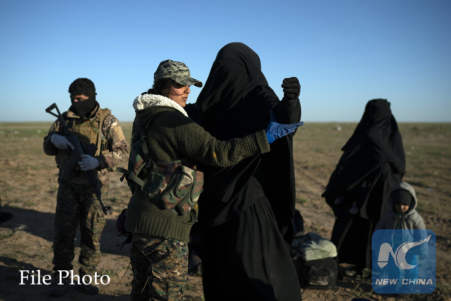 In this Friday, March 1, 2019 file photo, a woman is frisked by a U.S.-backed Syrian Democratic Forces (SDF) fighter at a screening area after being evacuated out of the last territory held by Islamic State group militants, in the desert outside Baghouz, Syria. (AP PHOTO)
