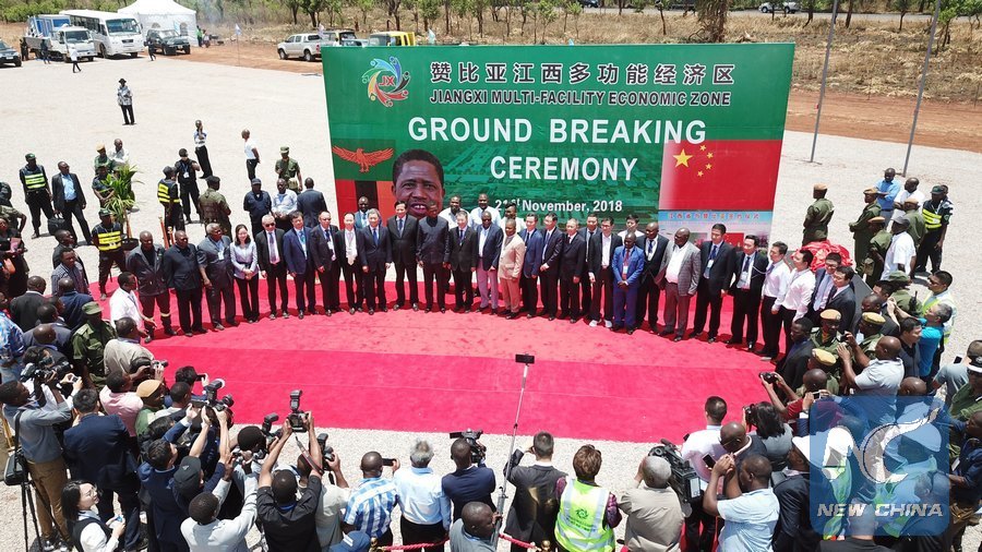 People attend the ground breaking ceremony of Jiangxi Multi-Facility Economic Zone in Chibombo district, central province of Zambia, Nov. 22, 2018. A consortium of Chinese firms will construct a Multi-Facility Economic Zone in central Zambia's Chibombo district, with President Edgar Lungu saying the project will go a long way in helping the country in its endeavor to ensure value addition to local products. (Xinhua/Wang Chao)
