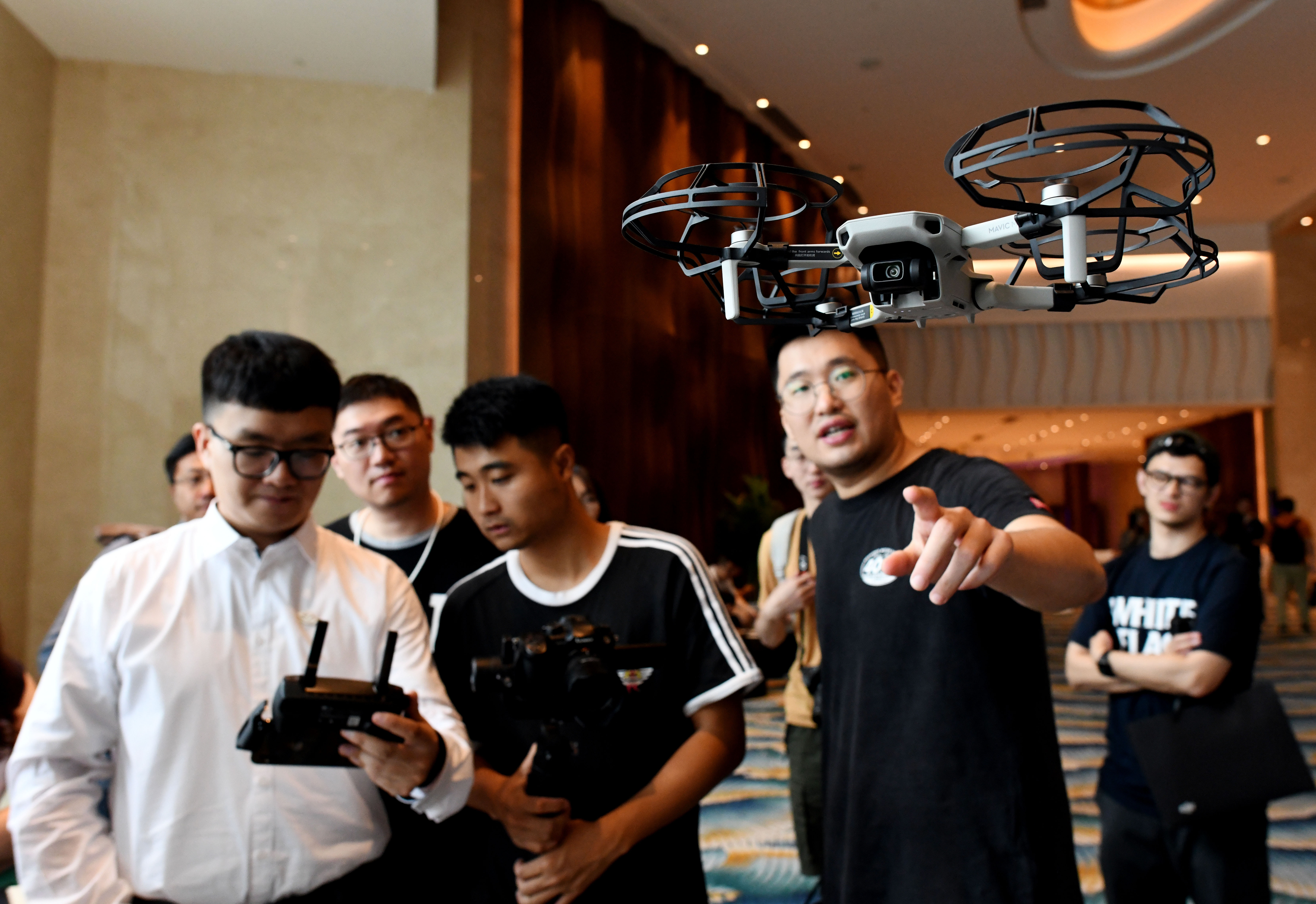 A man experiences the Mavic Mini drone unveiled during a new product launch event by DJI, a famous Chinese drone maker, in Sanya, south China's Hainan Province, Oct. 31, 2019. DJI officially unveiled its new drone product of Mavic Mini Wednesday. At a total weight of just 249g, the DJI Mavic Mini is foldable, palm-sized and designed with removable Lithium Ion battery promising 30 minutes of flight time on a single charge. (Xinhua/Zhao Yingquan)