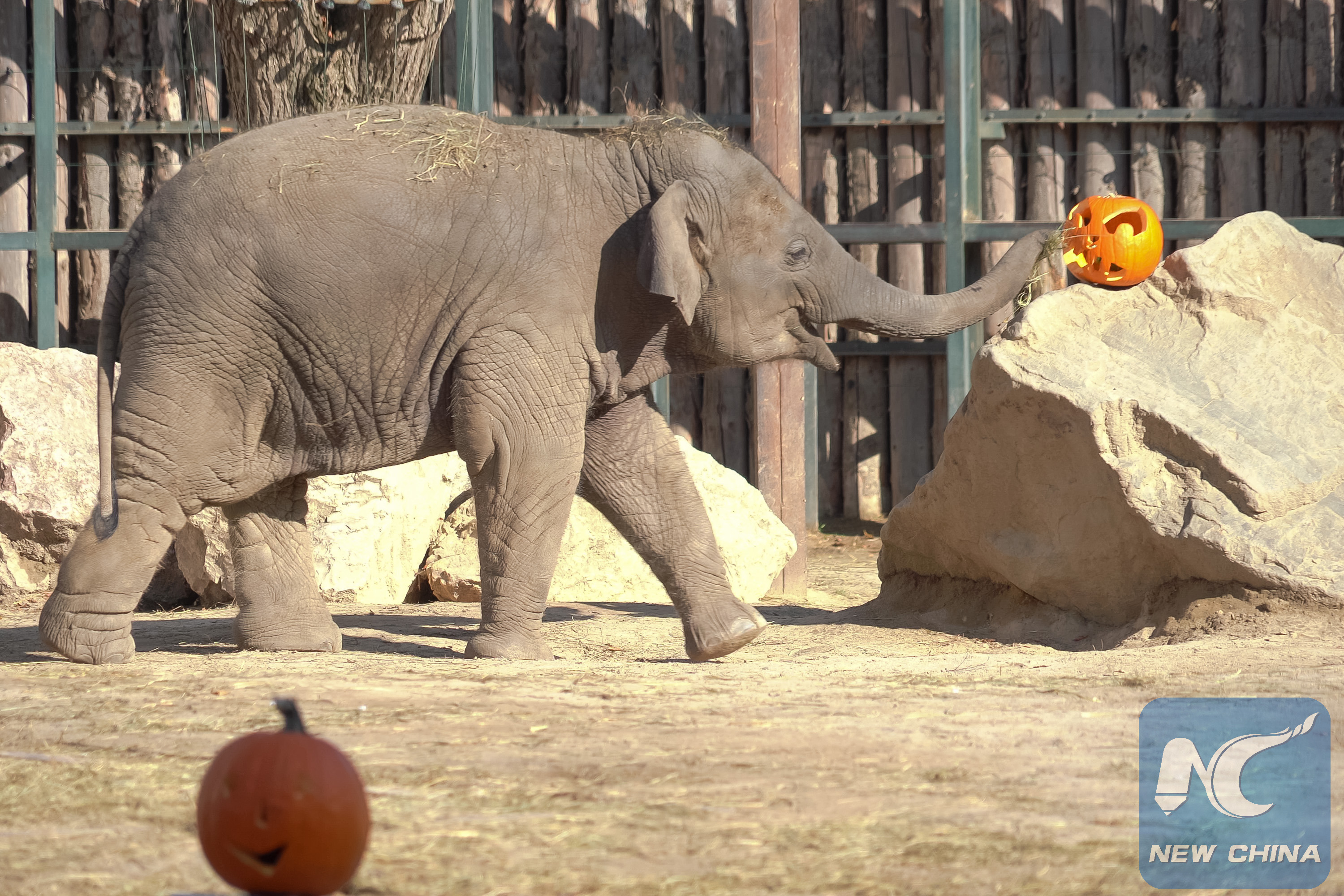An Asian elephant is seen with Halloween pumpkins as a Halloween treat in Budapest Zoo and Botanical Garden in Budapest, Hungary, Oct. 31, 2019. (Photo by Attila Volgyi/Xinhua)