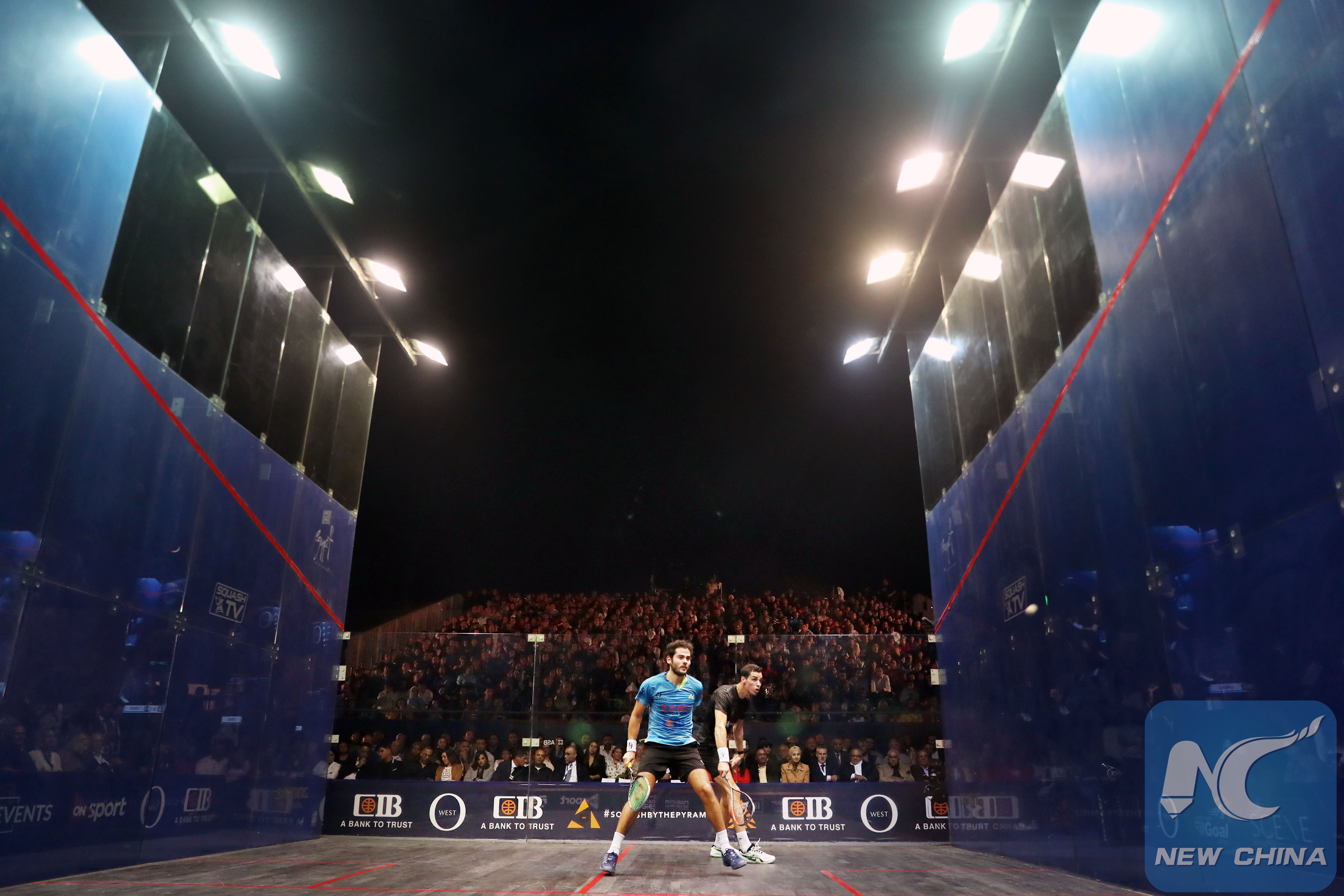 Karim Abdel Gawad (L) of Egypt competes with Ali Farag of Egypt during the Men's Egyptian Squash Open final in Giza, Egypt, on Nov. 1, 2019. (Xinhua/Ahmed Gomaa)