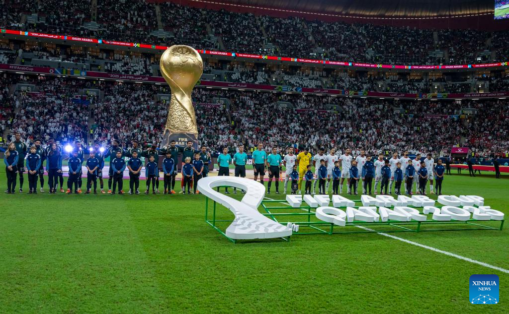 Players and referees line up prior to the FIFA Arab Cup 2025 Semi-final match between Saudi Arabia and Jordan at Al Bayt Stadium in Al Khor, Qatar, on Dec. 15, 2025. (Photo by Nikku/Xinhua)