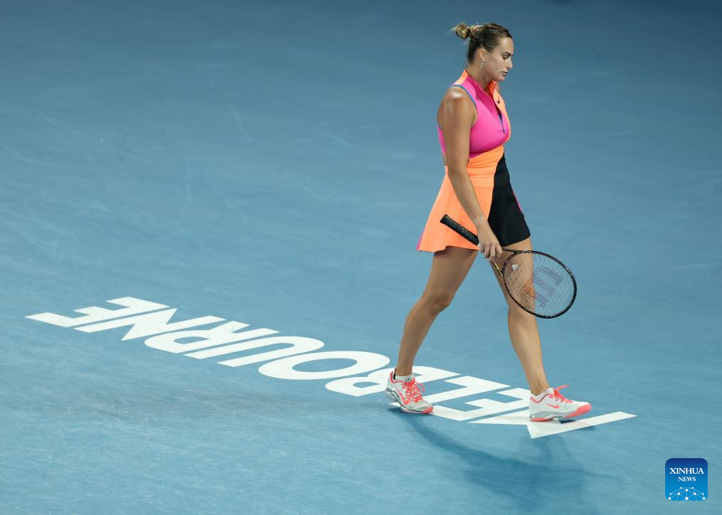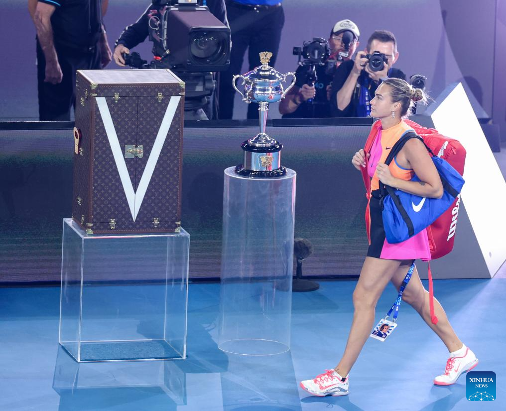Aryna Sabalenka enters the court before the women's singles final between Elena Rybakina of Kazakhstan and Aryna Sabalenka of Belarus at the Australian Open tennis tournament in Melbourne, Australia, Jan. 31, 2026. (Xinhua/Ma Ping)