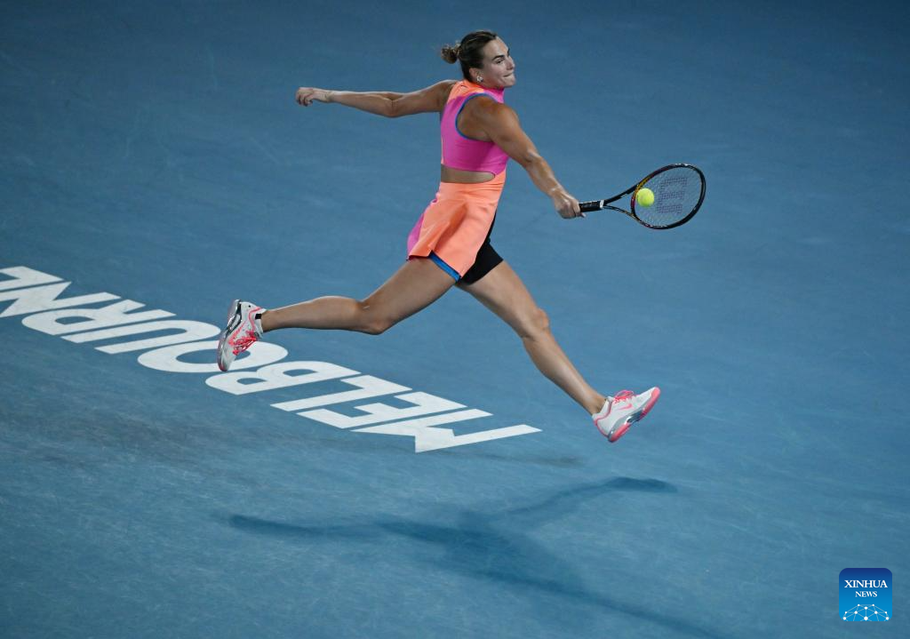 Aryna Sabalenka hits a return during the women's singles final between Elena Rybakina of Kazakhstan and Aryna Sabalenka of Belarus at the Australian Open tennis tournament in Melbourne, Australia, Jan. 31, 2026. (Photo by Wang Shen/Xinhua)