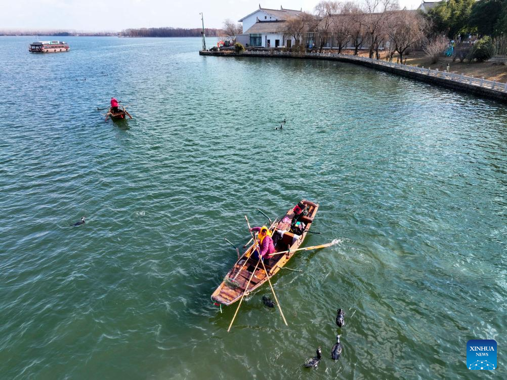 A drone photo shows fishermen fishing during a winter fishing event in Taizhou, east China's Jiangsu Province, Jan. 31, 2026. (Photo by Gu Jihong/Xinhua)