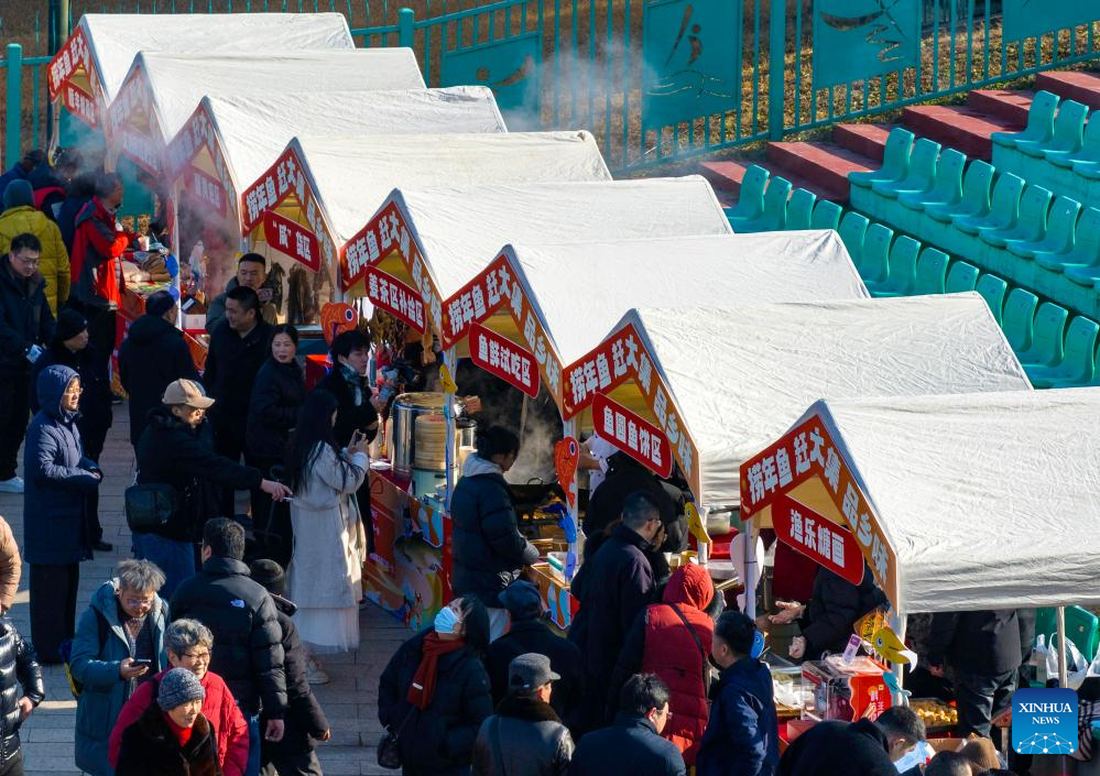 A drone photo shows people visiting a fish market during a winter fishing event in Taizhou, east China's Jiangsu Province, Jan. 31, 2026. (Photo by Tang Dehong/Xinhua)