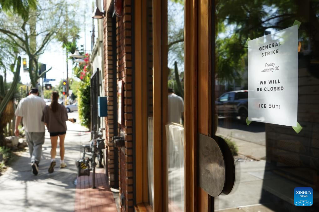 A store joins the "National Shutdown" with a protest sign in Los Angeles, California, the United States, on Jan. 30, 2026. Protesters gathered across the United States on Friday for a nationwide general strike against federal immigration enforcement operations and the recent fatal shootings by immigration agents.(Xinhua)
