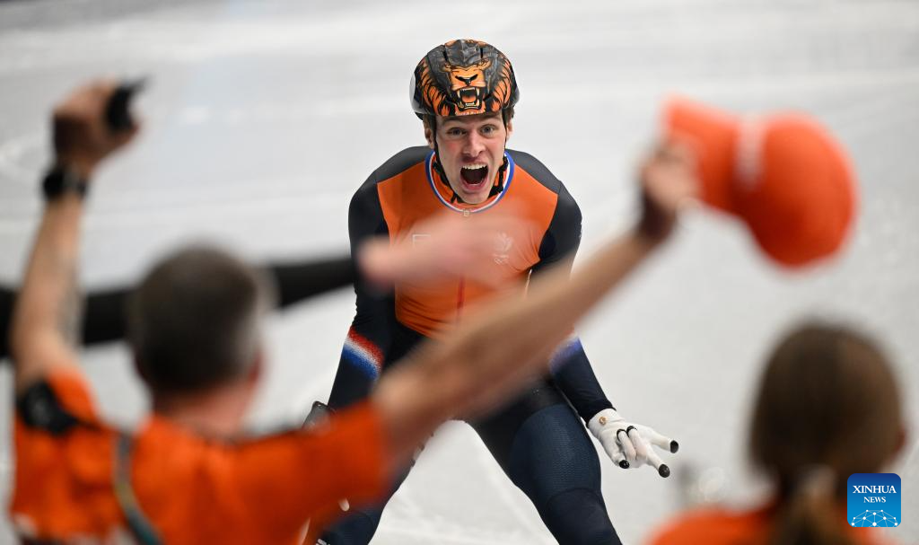 Jens van 'T Wout of the Netherlands celebrates after the short track speed skating men's 1000m final A at the Milan-Cortina 2026 Olympic Winter Games in Milan, Italy, Feb. 12, 2026. (Xinhua/Cheng Min)