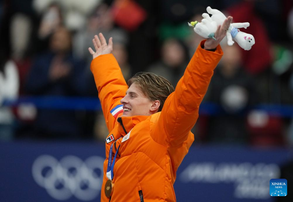 Gold medalist Jens van 'T Wout of the Netherlands celebrates during the awarding ceremony of the short track speed skating men's 1000m at the Milan-Cortina 2026 Olympic Winter Games in Milan, Italy, Feb. 12, 2026. (Xinhua/Xue Yuge)