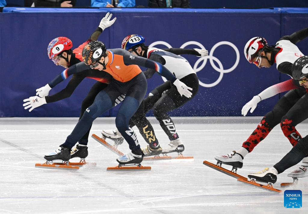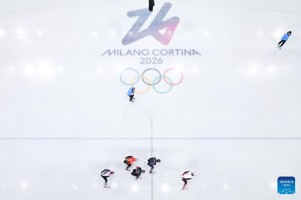Athletes compete during the short track speed skating men's 1000m final A at the Milan-Cortina 2026 Olympic Winter Games in Milan, Italy, Feb. 12, 2026. (Xinhua/Chen Yichen)