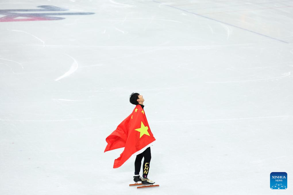 Sun Long of China celebrates after the short track speed skating men's 1000m final A at the Milan-Cortina 2026 Olympic Winter Games in Milan, Italy, Feb. 12, 2026. (Xinhua/Li Ming)