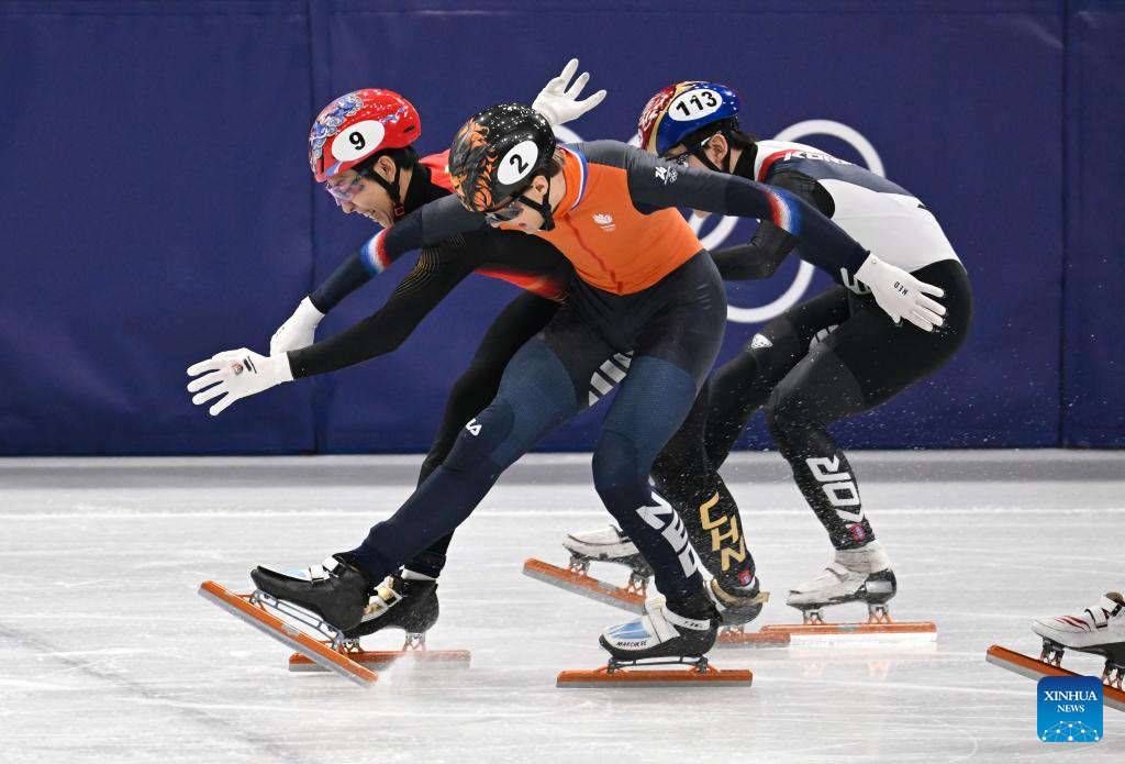 Sun Long (1st L) of China falls over after crossing the finish line during the short track speed skating men's 1000m final A at the Milan-Cortina 2026 Olympic Winter Games in Milan, Italy, Feb. 12, 2026. (Xinhua/Xue Yuge)