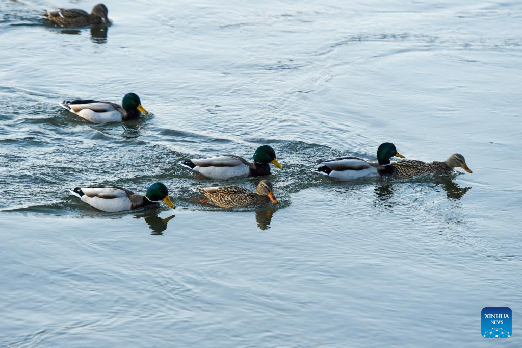 Birds inhabit the waters of Changbai Island in Jilin City, northeast China's Jilin Province, Jan. 28, 2026. Wang Tingting, a post-90s bird protector, stays every day at Changbai Island wetland park, a bird paradise seated by the Songhua River in Jilin City, to care for the birds--providing food and observing their living conditions.