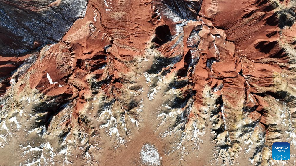 An aerial drone photo taken on Jan. 29, 2026 shows a scene of the Hongya Tableland in Siziwang Banner, north China's Inner Mongolia Autonomous Region. Located in the northern part of Siziwang Banner in Ulanqab, the Hongya Tableland is a key component of the Siziwang National Geopark in north China's Inner Mongolia Autonomous Region. Featuring towering red hills and deep gullies, the landscape forms a majestic painting with lingering snow. (Xinhua/Bei He)