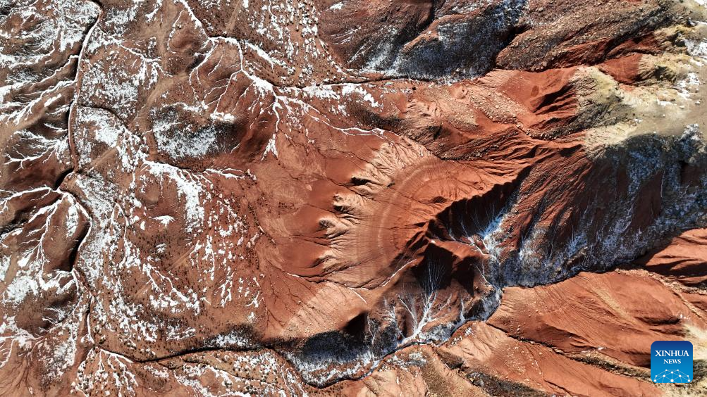 An aerial drone photo taken on Jan. 29, 2026 shows a scene of the Hongya Tableland in Siziwang Banner, north China's Inner Mongolia Autonomous Region. Located in the northern part of Siziwang Banner in Ulanqab, the Hongya Tableland is a key component of the Siziwang National Geopark in north China's Inner Mongolia Autonomous Region. Featuring towering red hills and deep gullies, the landscape forms a majestic painting with lingering snow. (Xinhua/Bei He)