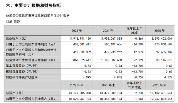 新华网北京4月13日电(记者 胡可璐)4月12日晚间,张裕A(以下简称张裕)发布2022年年度报告。年报显示,2022年张裕实现营业收入39.19亿元,同比微降0.86%;实现净利润4.29亿元,同比下降14.28%。