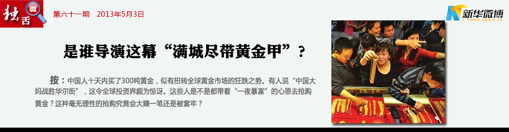 【黃金周?NO!是搶金周!】 “五一”假期,“黃金周”變成了“搶金周”,金店堪比景點,金飾變成普通老百姓的“撈底”對象?!?br />