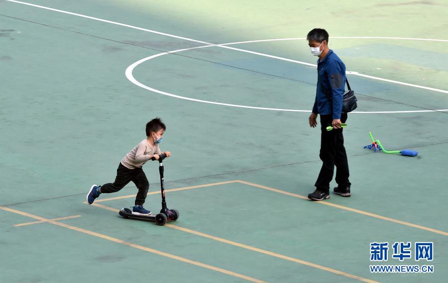 1月23日,家長帶著小朋友在戶外玩耍。新華社記者 盧炳輝 攝