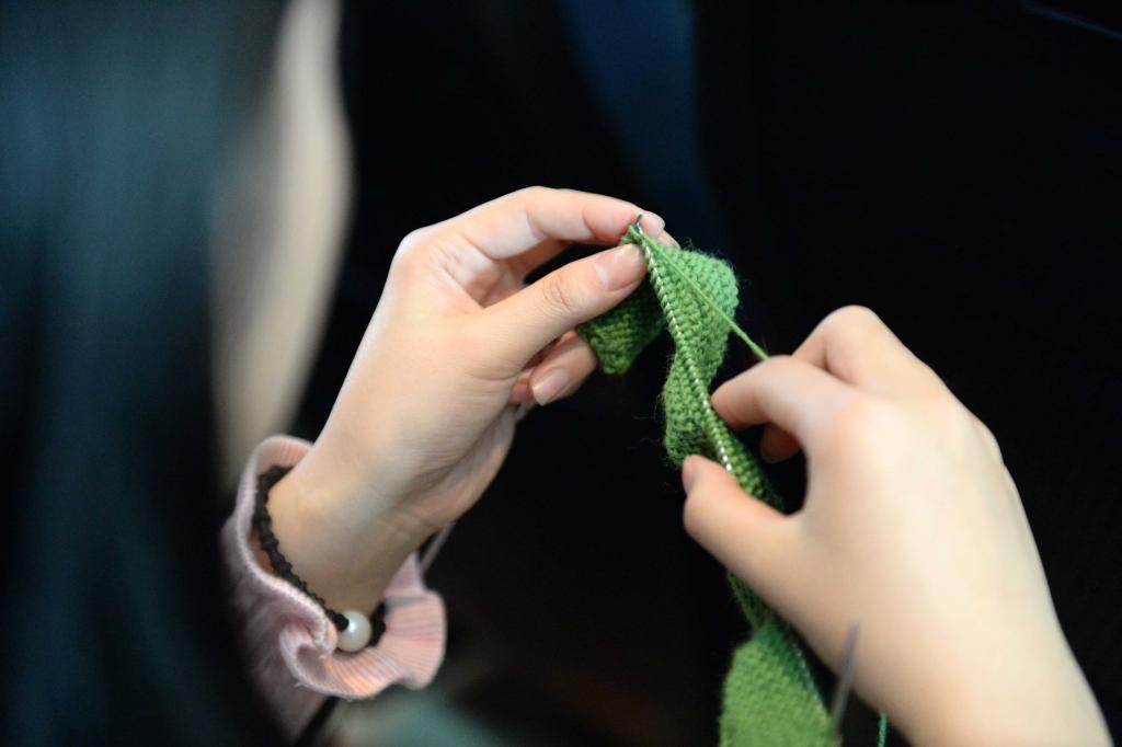 青年学生在“恒爱行动”活动中织“爱心毛衣”。(资料照片)新华社记者 王凯 摄