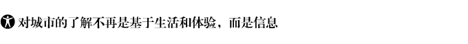 ![]() 城市越冒險,生活其中的人們對城市就會越陌生。可見的事實是,人們對城市的了解不再是基于生活和體驗,而是信息。此前延續多年的城市生活規律和節奏被互聯網打破了,互聯網把城市的每一部分都終端化,城市的每一個具有生命特征的組織不再受生理和情理的連接,而是信息的連接。一方面,信息成為連接人與人、人與城市、城市與城市的單一工具,信息把城市圈成了地域以外的另一種空間,只是,信息的流動性并沒有協助人了解城市,反倒是增加了越來越多的陌生。 另一方面,陌生又完成了城市開放意象的表達,這也是一座城市為什么能吸引外來者旅游、造訪、定居的重要原因。信息的獨立和集合讓人、讓城市的局部在封閉系統之外,又像互聯網時代的物流一樣多樣化、復合化。 |