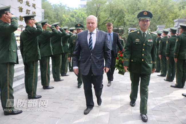俄羅斯駐華大使安德烈·杰尼索夫向武警警衛(wèi)部隊李登貴烈士雕塑敬獻花籃