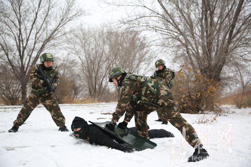 ????連日來,新疆昌吉自治州出現持續降溫天氣。2016年12月11日,新疆公安邊防總隊訓練基地組織2016級新入警大學生開展極端天氣實戰演練作業,內容涵蓋了處突作業、小組戰術、反襲擊格斗技巧等邊防常用作戰內容,全面培養了入警學員在貼近實戰環境中的作戰意識、作戰技能和戰場心理素質,為適應第一任職打下堅實的基礎。(唐紫煜 劉濤)