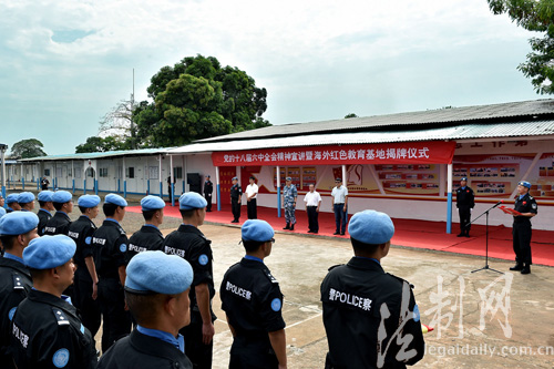 ????利比里亞時間12月13日,中國第四支駐利比里亞維和警察防暴隊舉行首個海外紅色教育基地揭牌儀式活動。駐利大使館、商會、中資企業及華人華僑等200余人參加揭牌儀式活動。