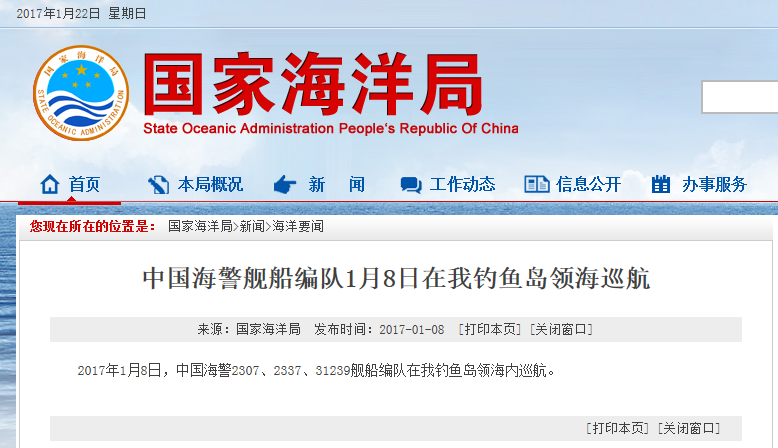 新華網(wǎng)北京1月22日電 據(jù)國(guó)家海洋局網(wǎng)站報(bào)道,2017年1月22日,中國(guó)海警2501、2308、2302艦船編隊(duì)在我釣魚島領(lǐng)海內(nèi)巡航。
