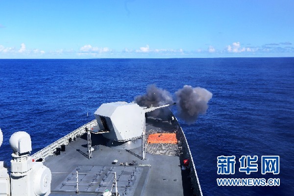 2月19日,在海上現場反擊演練中,長沙艦對“敵艦”進行主炮火力射擊。