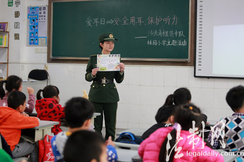 圖為邊防官兵為小學生們介紹愛護耳朵的知識