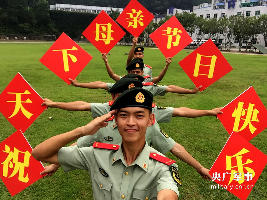 5月13日,武警廣東省邊防總隊機動支隊官兵手舉祝福語,一起為母親送上節日問候。
