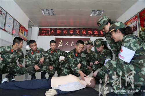 圖為邊防總醫院急診科醫生指導基層官兵學習心肺復蘇急救技能