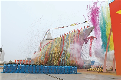 9時(shí)許,儀式開(kāi)始,全體人員齊聲高唱國(guó)歌,鮮艷的五星紅旗冉冉升起。剪彩后進(jìn)行了“擲瓶禮”,一瓶香檳酒在艦艏摔碎,絢麗的彩帶從兩舷噴射而出,新型驅(qū)逐艦鳴響汽笛,全場(chǎng)響起熱烈掌聲。隨后,驅(qū)逐艦在拖曳牽引下緩緩移上浮箱后下水。