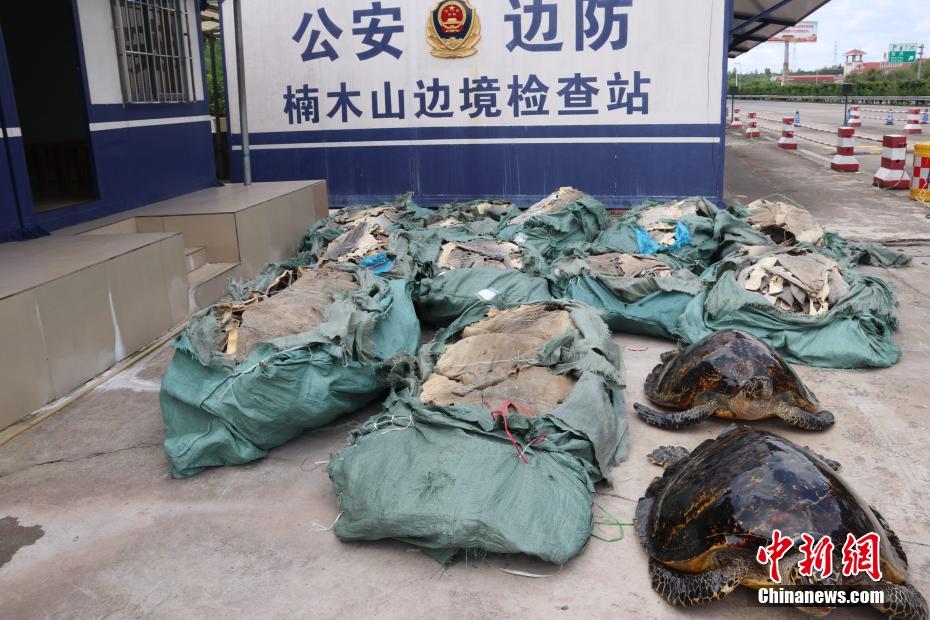 ????6月27日,廣西防城港邊防支隊楠木山邊境檢查站執勤官兵在對一輛重型廂式貨車例行檢查時,查獲涉嫌非法運輸玳瑁標本2只、鯊魚皮11袋。這兩只玳瑁標本重量共達到40多公斤,而11袋鯊魚皮重約1噸。據悉,玳瑁是國家二級重點保護野生動物,已被列入《世界自然保護聯盟》(IUCN)2012年瀕危物種紅色名錄。(張振國)